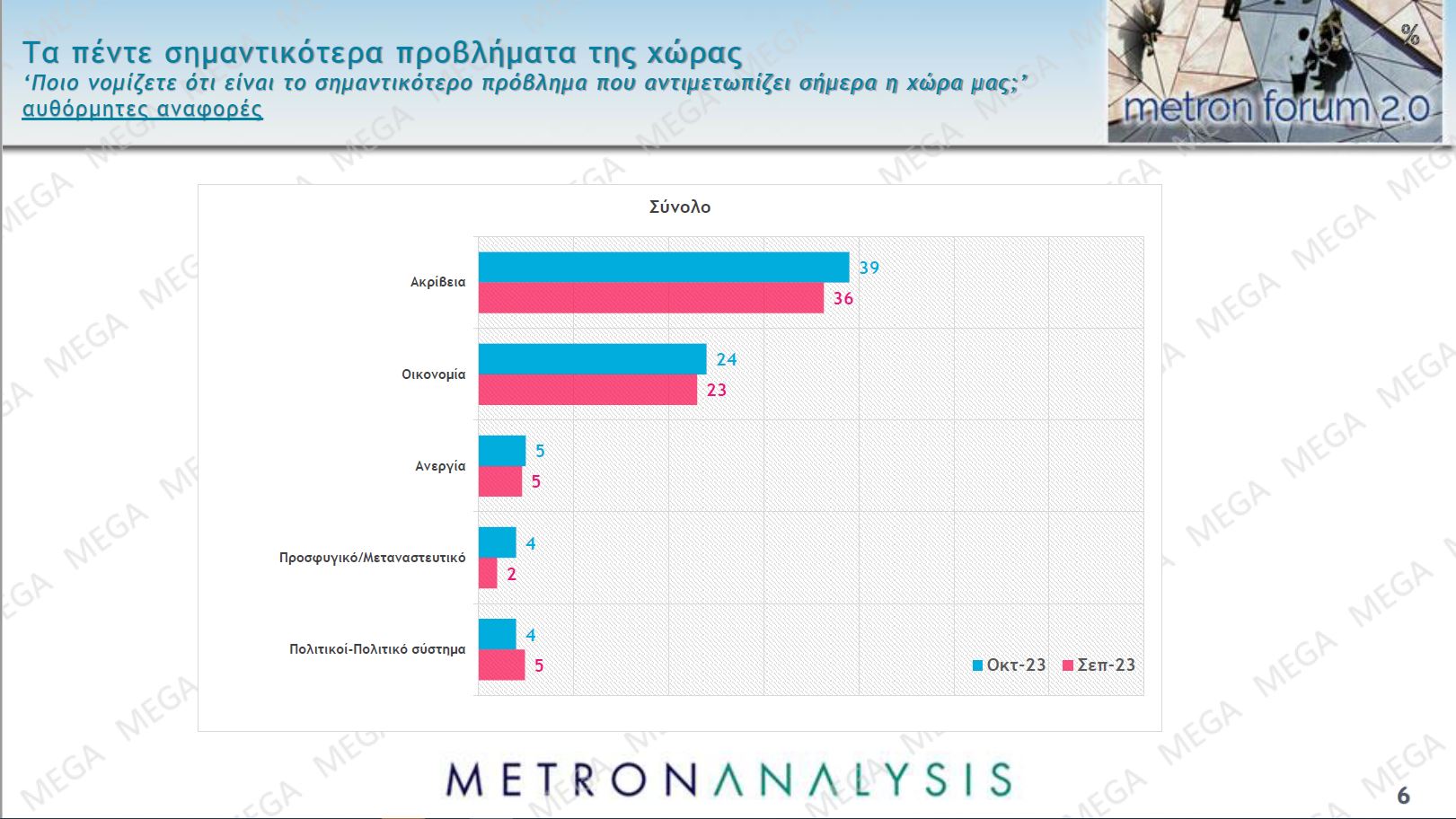 Τι ανησυχεί τους πολίτες; Η οικονομία. Στην ερώτηση ποιο είναι το σημαντικότερο πρόβλημα που αντιμετωπίζει η χώρα το 39% απαντάει η οικονομία (36% τον Σεπτέμβριο) και 24% η ακρίβεια (23% το Σεπτέμβριο). Αντιθέτως, όλα τα άλλα προβλήματα έχουν πολύ χαμηλότερο ποσοστό. Αυτό δείχνει πόσο μεγάλη είναι η αγωνία για το κόστος ζωής ιδίως μπροστά στον χειμώνα που έρχεται. Πράγμα που σημαίνει ότι το εάν δεν αντιμετωπιστεί το κύμα ακρίβειας και η αίσθηση οικονομικής ανασφάλειας, οι παράμετροι αυτοί θα κρίνουν σε μεγάλο βαθμό και το πώς θα διαμορφωθεί το πολιτικό σκηνικό γενικότερα.
