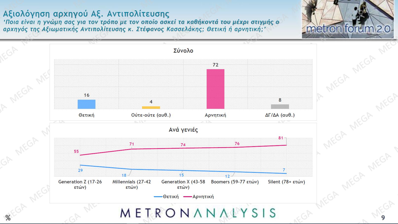 Μόνο το 16% των ερωτηθέντων έχει θετική για το πώς ασκεί τα καθήκοντά του ως αρχηγός, ενώ το 72% έχει αρνητική γνώμη.