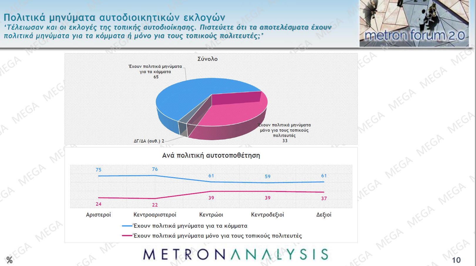 Ενδιαφέρον έχει και το πώς αποτιμούν οι πολίτες τα μηνύματα που έστειλαν οι πρόσφατες αυτοδιοικητικές εκλογές. Καταρχάς το μεγαλύτερο μέρος των ερωτώμενων (65%) πιστεύουν ότι τα αποτελέσματα έχουν πολιτικά μηνύματα για τα κόμματα και όχι μόνο για τους τοπικούς πολιτευτές (κάτι που υποστηρίζει μόνο το 33%). Μάλιστα, όσο πιο αριστερά πάμε στον πολιτικό άξονα τόσο περισσότερο βλέπουμε να υπογραμμίζεται η κεντρική πολιτική σημασία των εξετάσεων.