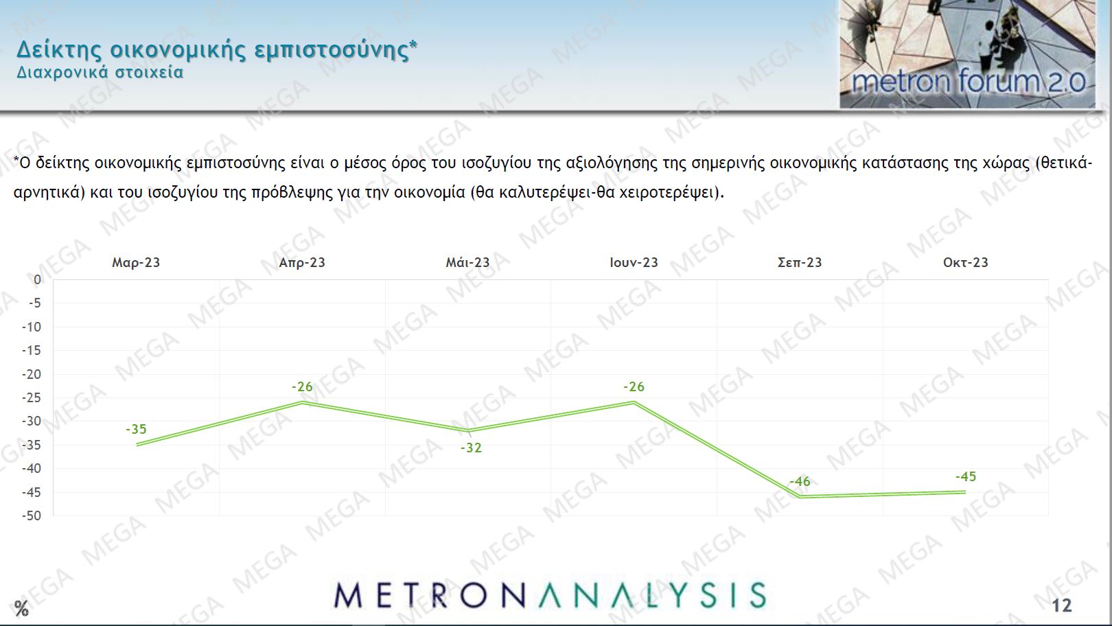 Αυτό αποτυπώνεται και στον δείκτη οικονομικής εμπιστοσύνης (που είναι ο μέσος όρος του ισοζυγίου της αξιολόγησης της σημερινής οικονομικής κατάστασης και της πρόβλεψης για την οικονομία), που παραμένει σταθερά αρνητικός στο -45.