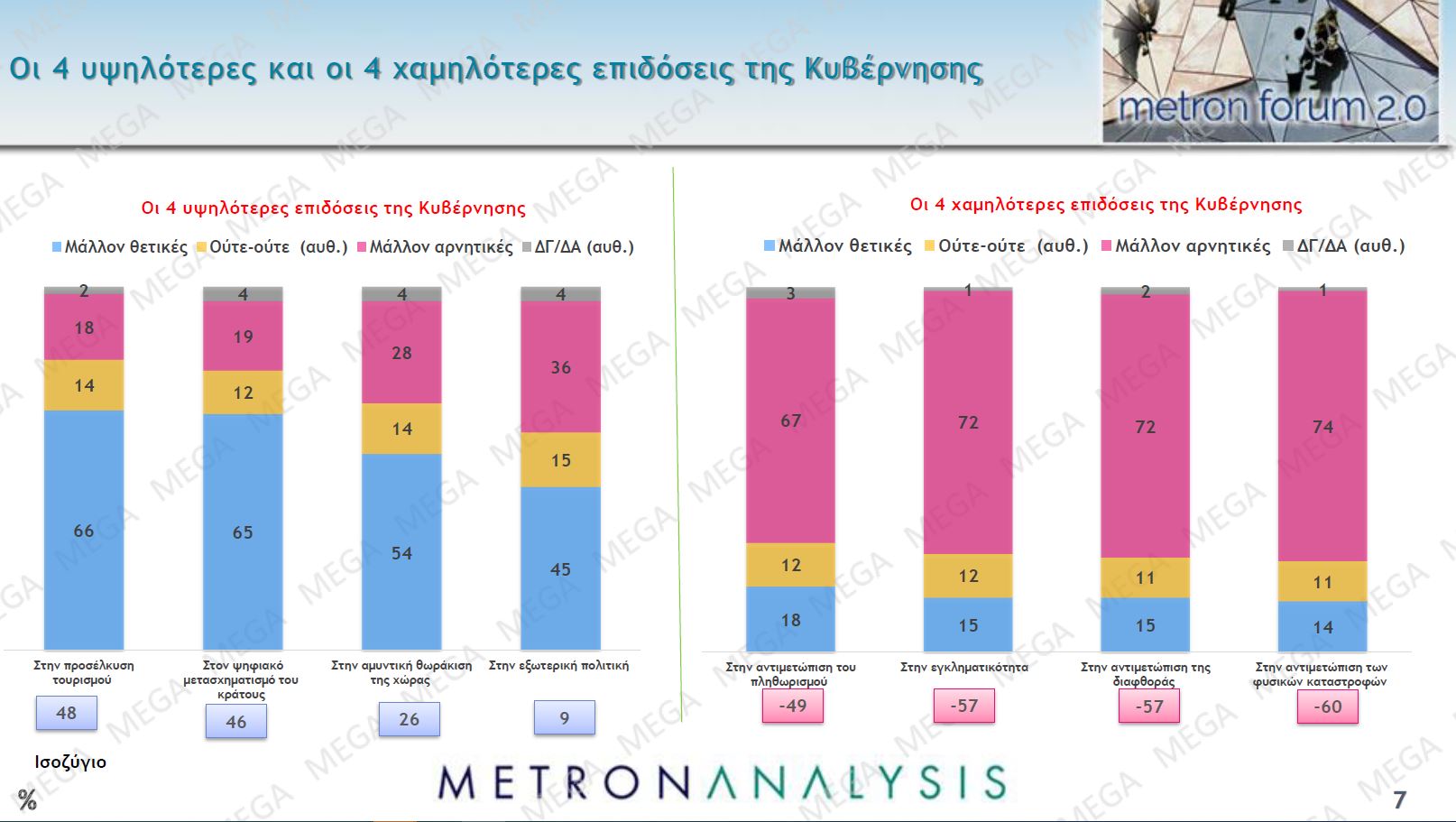 Αντιθέτως, «κόκκινη κάρτα» βγάζουν οι πολίτες στην κυβέρνηση στην αντιμετώπιση των φυσικών καταστροφών (74% αρνητικές γνώμες), στην αντιμετώπιση της διαφθοράς (72% αρνητικές γνώμες), την στην αντιεγκληματική πολιτική (72% αρνητικές γνώμες), την αντιμετώπιση του πληθωρισμού (67%).
