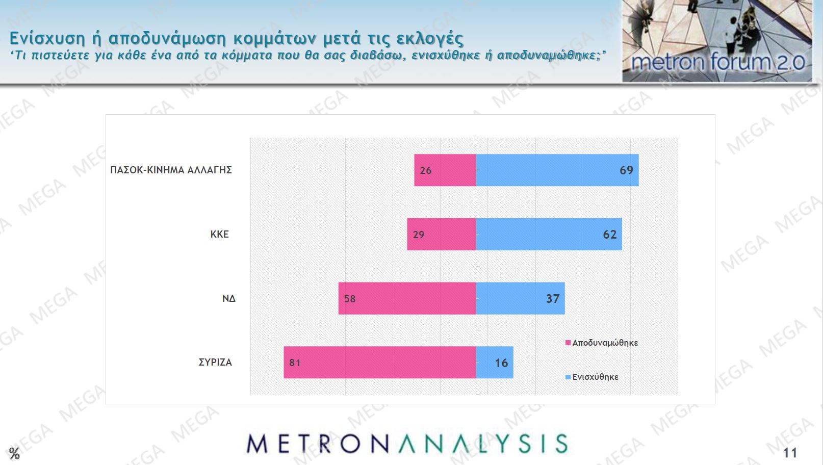Τώρα ως προς το ποιο κόμμα ενισχύθηκε από τις αυτοδιοικητικές εκλογές οι πολίτες εκτιμούν ότι περισσότερο ενισχύθηκε το ΠΑΣΟΚ-ΚΙΝΑΛ και ακολουθεί το ΚΚΕ. Αντιθέτως τόσο για τη ΝΔ όσο και τον ΣΥΡΙΖΑ η γνώμη των ερωτώμενων πολιτικών είναι μάλλον αποδυναμώθηκαν παρά ενισχύθηκαν, με την πιο σαφή εικόνα αποδυνάμωσης να σχηματίζεται για τον ΣΥΡΙΖΑ (81% εκτιμά ότι αποδυναμώθηκε και μόλις 16% ότι ενισχύθηκε).