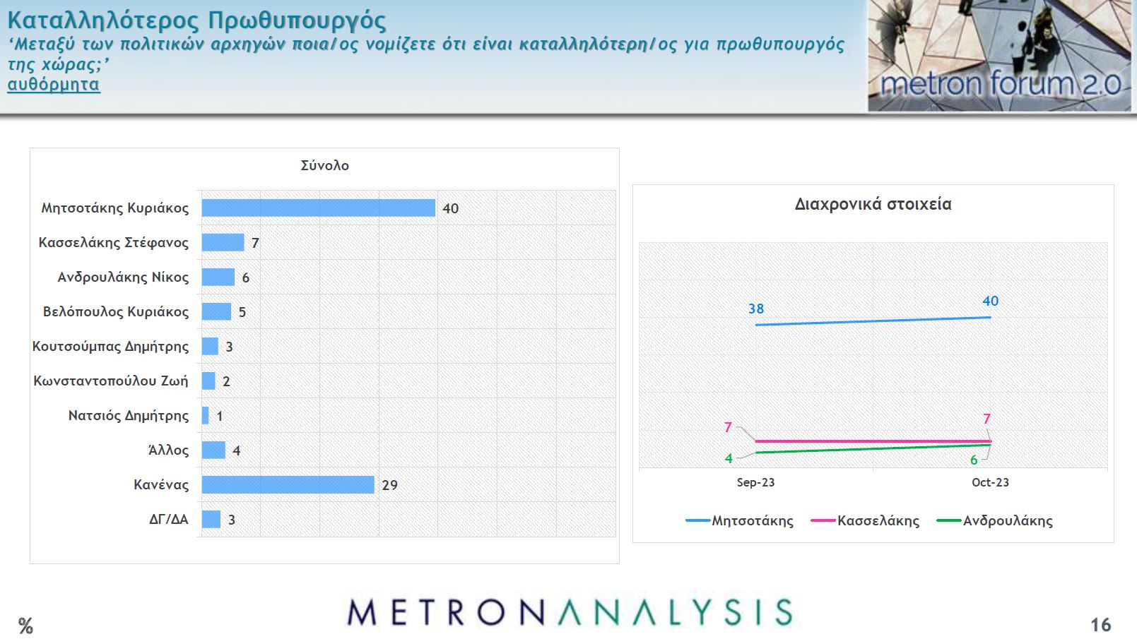 Ως προς την ερώτηση για τον καταλληλότερο πρωθυπουργό ο Κυριάκος Μητσοτάκης έχει ένα σαφές προβάδισμα αφού συγκεντρώνει το 40% των απαντήσεων, πολύ μπροστά από το 7% του Στέφανου Κασσελάκη και το 6% του Νίκου Ανδρουλάκη. Αυτό που εντυπωσιάζει είναι ότι ο ισχυρότερος αντίπαλος του Κυριάκου Μητσοτάκη αυτή τη στιγμή είναι ο «Κανένας», αφού αυτή είναι η αυθόρμητη απάντηση για το 29% των ερωτηθέντων.