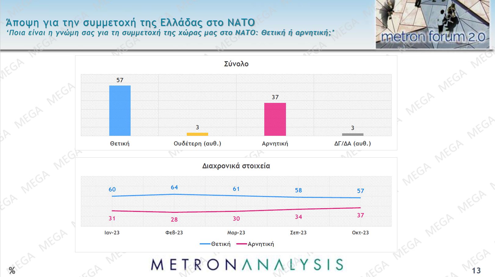 Η δημοσκόπηση περιλάμβανε και ερώτηση για το εάν αντιμετωπίζεται θετικά ή αρνητικά η συμμετοχή της χώρας στο ΝΑΤΟ. Εδώ το 57% απάντησε ότι είναι θετική η συμμετοχή της Ελλάδας στο ΝΑΤΟ και 37% ότι είναι αρνητική. Αυτό είναι το υψηλότερο ποσοστό αρνητικών γνωμών από την αρχή της χρονιάς και αποτυπώνει μια σχετική έλλειψη εμπιστοσύνης στους δυτικούς αμυντικούς θεσμούς δύο χρόνια μετά την έναρξη του πολέμου στην Ουκρανία.