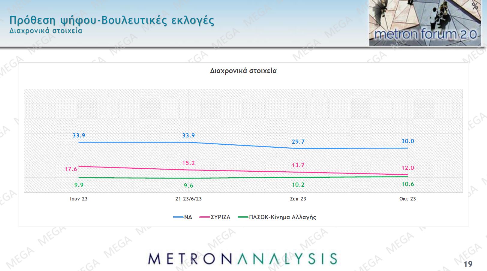 Αυτό που παρατηρεί κανείς είναι ότι η ΝΔ διατηρεί μια σαφή πρωτοκαθεδρία με 30% απαντήσεις στην πρόθεση ψήφου, την ώρα που ο ΣΥΡΙΖΑ συνεχίζει να υποχωρεί, με 12% ενώ τον Σεπτέμβριο είχε 13.7%, ενώ ενισχύονται το ΠΑΣΟΚ και το ΚΚΕ και υποχωρούν οι υπόλοιποι σχηματισμοί.