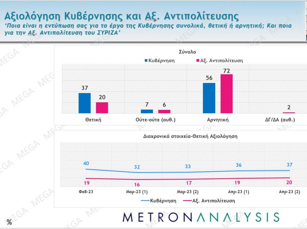 Ως προς την αξιολόγηση των κομμάτων, το 37% κρίνει θετικά την κυβέρνηση και το 20% θετικά την αξιωματική αντιπολίτευση. Αρνητικά κρίνει το κυβερνών κόμμα το 56% αλλά και 72% τον ΣΥΡΙΖΑ, κάτι που δικαιολογεί και τη διαφορά που διαχρονικά εμφανίζεται μεταξύ των δύο κομμάτων.