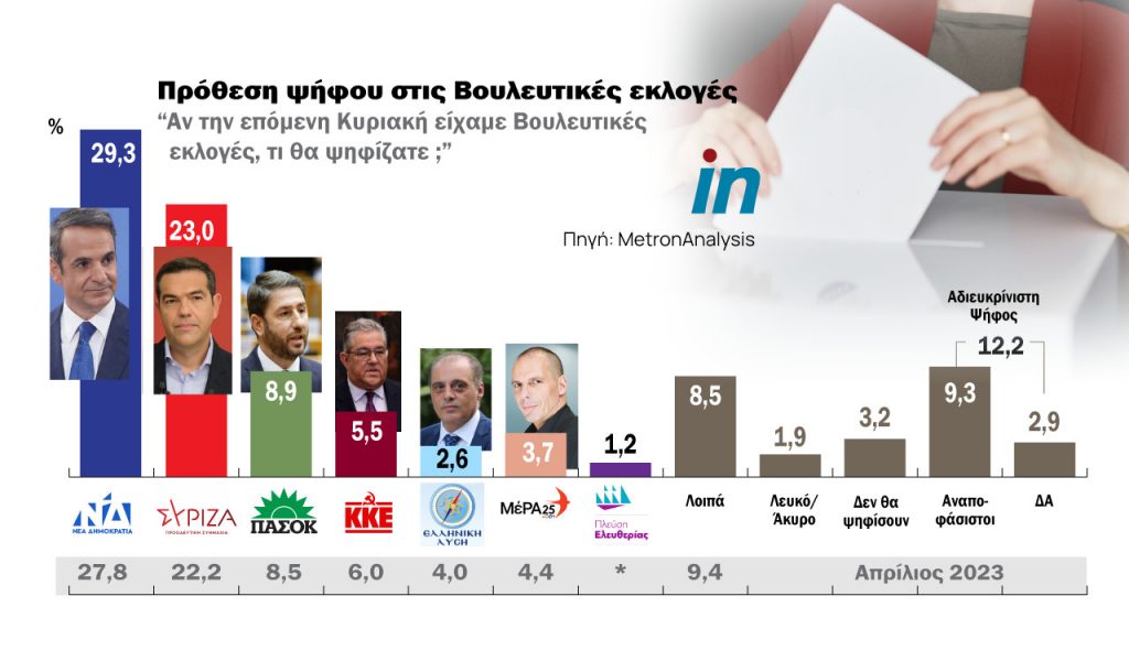 Στην πρόθεση ψήφου η Νέα Δημοκρατία λαμβάνει ποσοστό 29.3%, κερδίζοντας 1,5 μονάδα (27,8%) από τον Απρίλιο όπου το πολιτικό σκηνικό βάραινε ακόμη η τραγωδία στα Τέμπη.