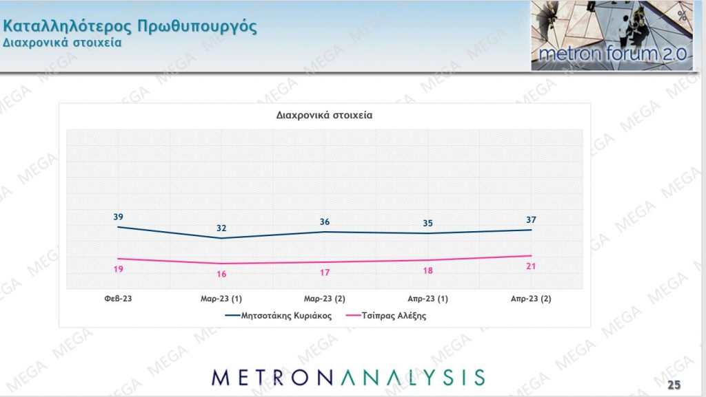 Καταλληλότερος για πρωθυπουργός με 37% προηγείται ο Κυριάκος Μητσοτάκης και ακολουθεί ο Αλέξης Τσίπρας με 21%, άνοδο δύο μονάδων για τον πρώτο και τριών για τον δεύτερο.