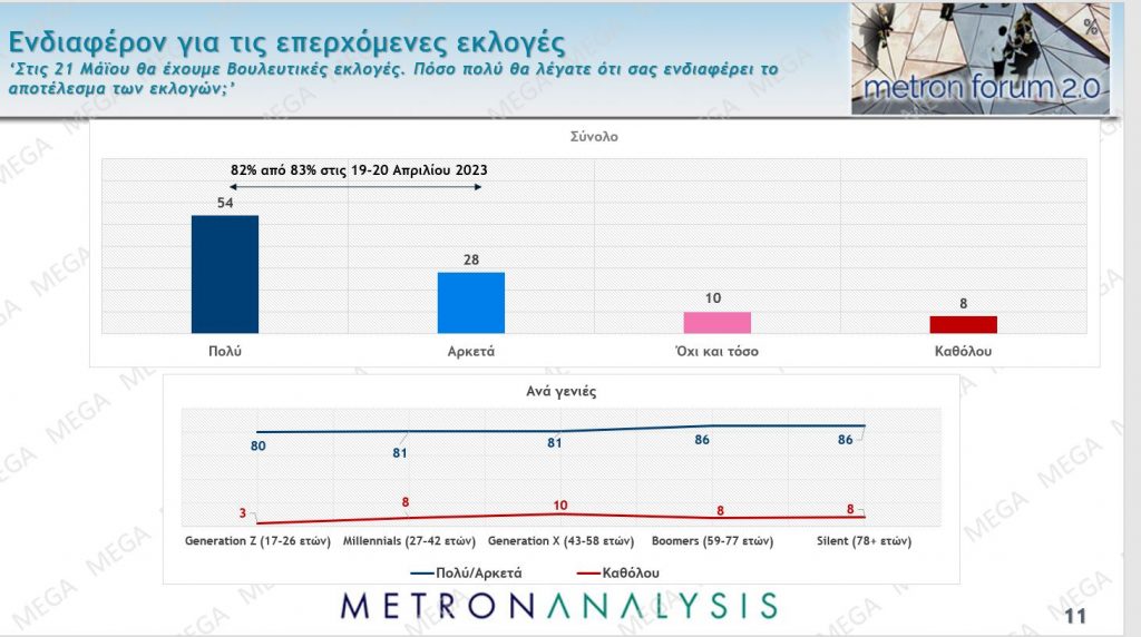 Πάνω από 8 στους 10 πολίτες (ποσοστό 82% από 83% τον Απρίλιο) ενδιαφέρεται πολύ ή αρκετά για τις εκλογές της 21ης Μαίου ενώ 10% όχι και τόσο και 8% καθόλου. Αυτοί που έχουν το μεγαλύτερο ενδιαφέρον είναι οι Boomers (59-77 ετών) με 86% και το ίδιο οι silent (78 ετών και πάνω).