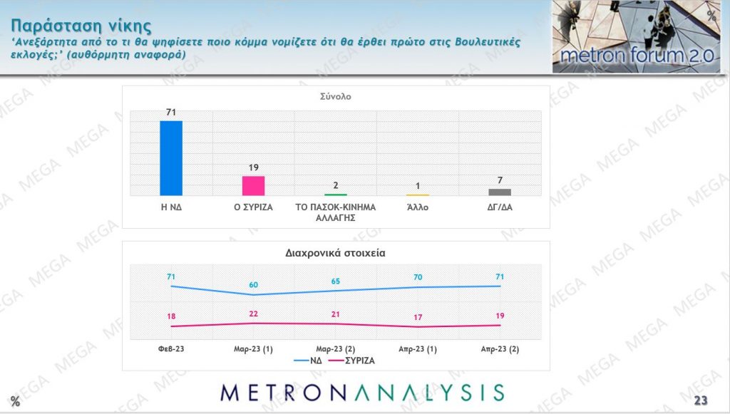 Στην παράσταση νίκης η ΝΔ προηγείται συντριπτικά με 71% έναντι 19% του ΣΥΡΙΖΑ και 2% του ΠΑΣΟΚ. Είναι δε το μεγαλύτερο ποσοστό που παίρνει η ΝΔ τους τελευταίους μήνες.