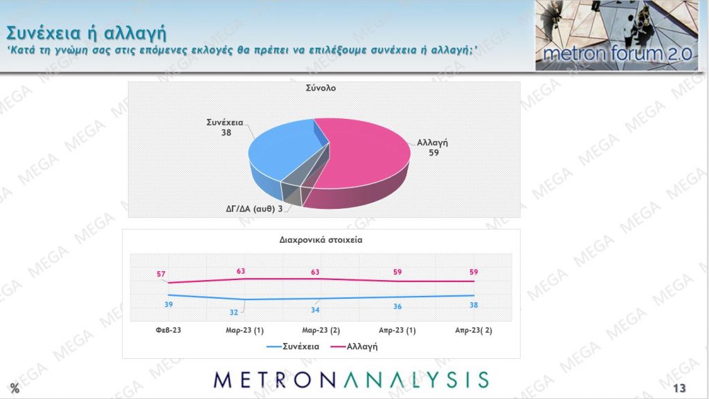 Εξαιρετικά ενδιαφέρον είναι το στοιχείο που λέει ότι έξι στους 10 πολίτες (59%) ζητά αλλαγή ενώ το 38% ζητά συνέχεια.