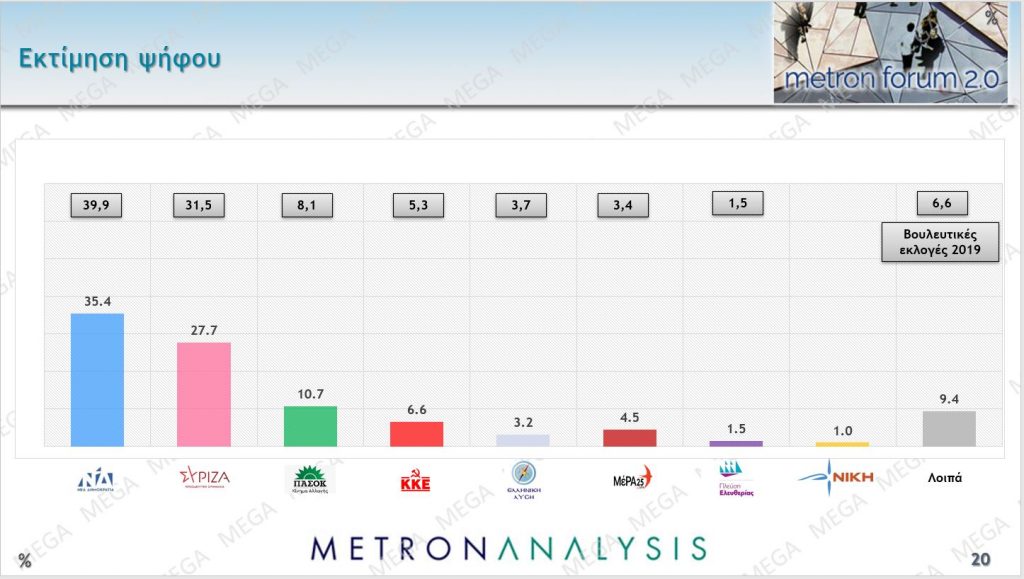 Με βάση τα ποσοστά αυτά η έρευνα της Metron Analysis δίνει 121 έδρες στη Νέα Δημοκρατία, 94 στον ΣΥΡΙΖΑ, 36 στο ΠΑΣΟΚ, 23 στο ΚΚΕ, 11 στην Ελληνική Λύση και 15 στο ΜέΡΑ 25.