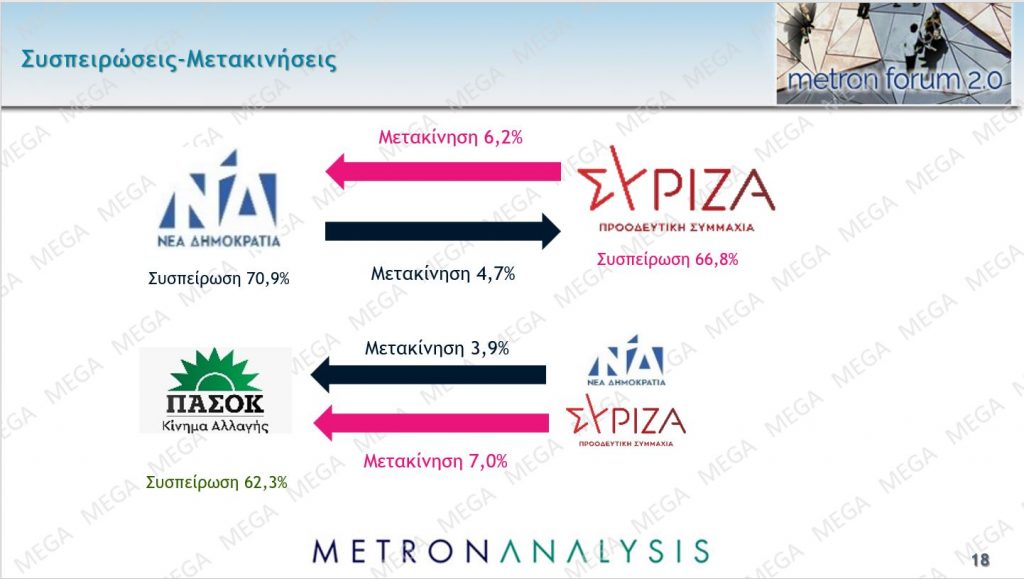 Ως προς τις συσπειρώσεις η ΝΔ βρίσκεται στο 70,9% με 4,7% να μετακινείται προς ΣΥΡΙΖΑ αλλά και 6,2% να φεύγει από την αξιωματική αντιπολίτευση για τη ΝΔ.