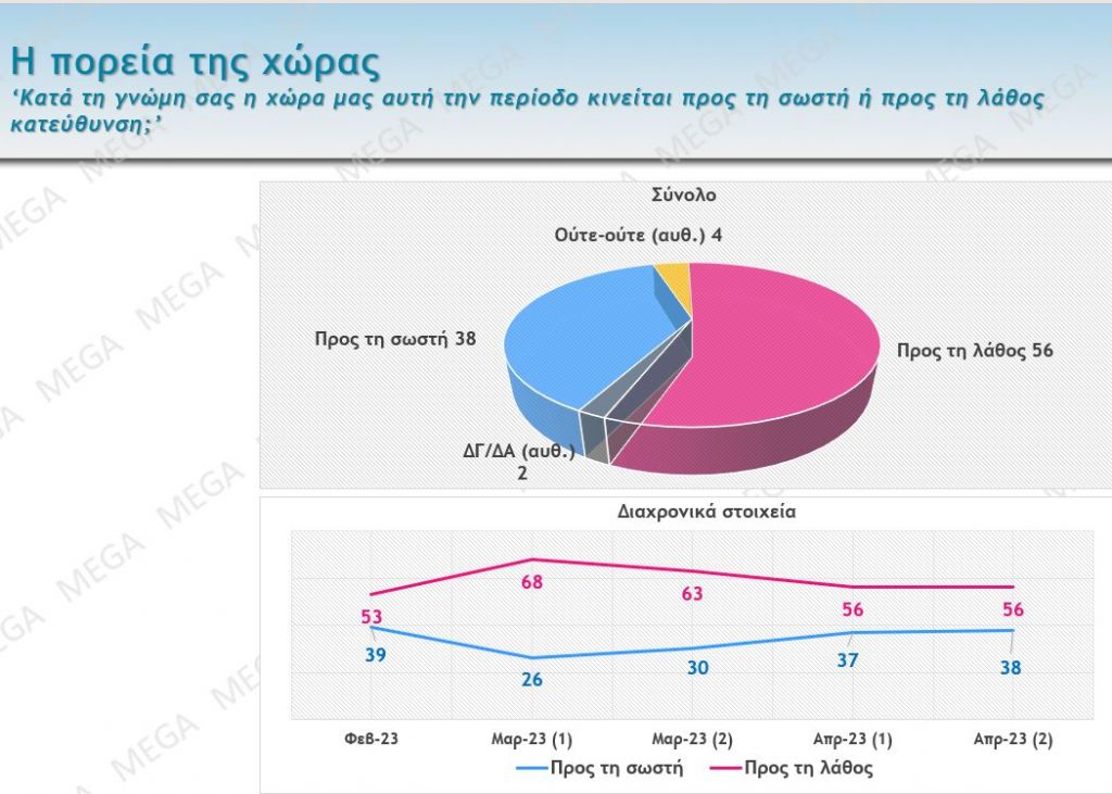 Στην έρευνα της Metron το 56% των ερωτηθέντων λέει ότι η χώρα βαδίζει προς τη λάθος κατεύθυνση και το 38% προς τη σωστή.