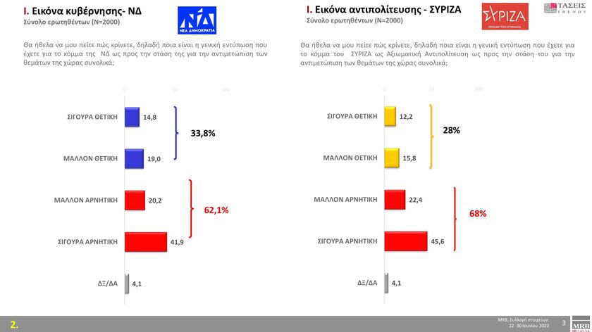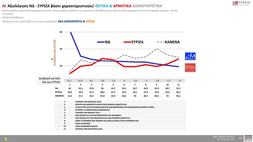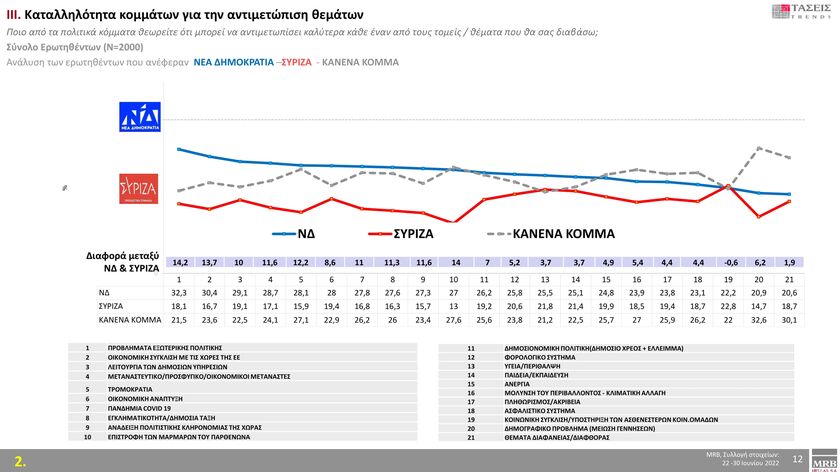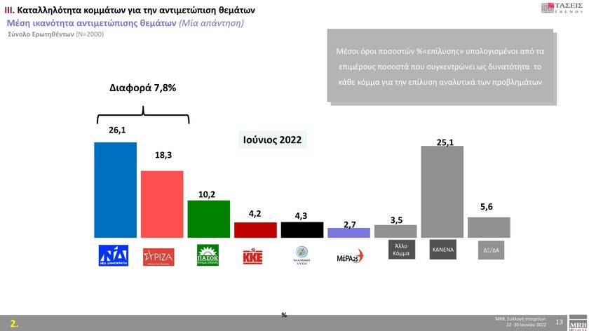 Εξάλλου, σύμφωνα με τα στοιχεία της δημοσκόπησης, στο ερώτημα ποιο κόμμα θεωρείται κατάλληλο για την αντιμετώπιση των σοβαρών θεμάτων που αντιμετωπίζει η χώρα, το 26,1% επιλέγει τη ΝΔ έναντι ποσοστού 18,3% που προτιμά τον ΣΥΡΙΖΑ.