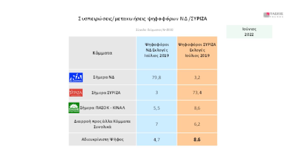 προηγούμενη μέτρηση (18%). Η Νέα Δημοκρατία εμφανίζει συσπείρωση στο 79,8% ενώ έχει αρχίσει να αυξάνεται και η συσπείρωση του ΣΥΡΙΖΑ (73,4%).