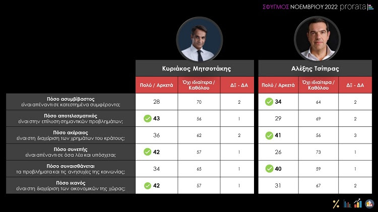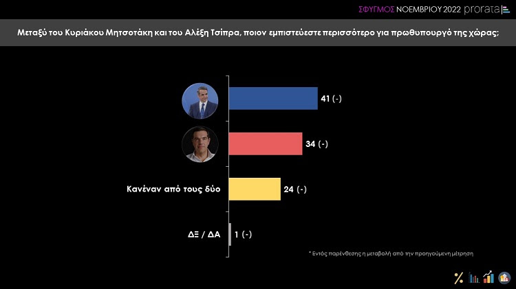 Καταλληλότερος πρωθυπουργός αναδεικνύεται ο Κυριάκος Μητσοτάκης, με ποσοστό 41% έναντι του 34% του Αλέξη Τσίπρα.