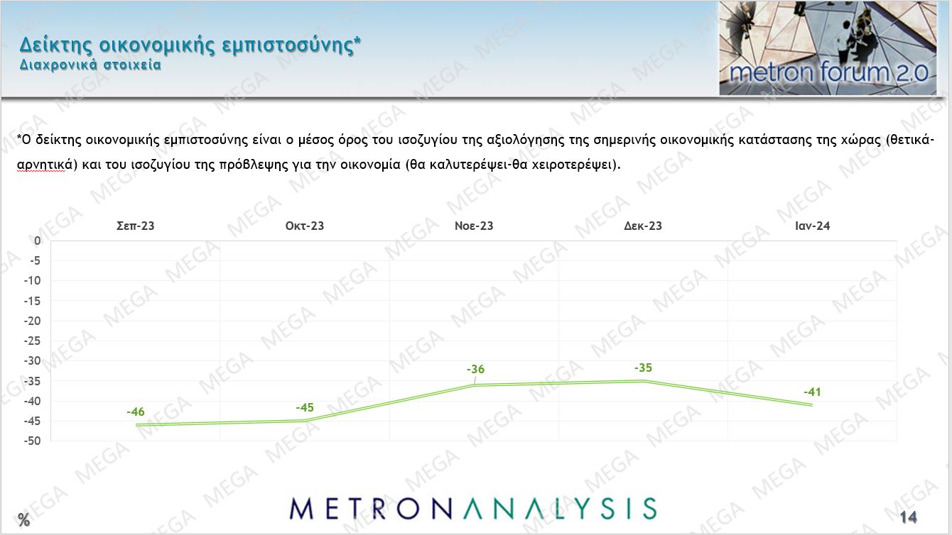 Αυτή η γενικότερα αρνητική εικόνα για τα πράγματα αποτυπώνεται και στην υποχώρηση του δείκτη οικονομικής εμπιστοσύνης, δηλαδή του μέσου όρου ανάμεσα στο ισοζύγιο της αξιολόγησης της σημερινής οικονομικής κατάστασης της χώρας και του ισοζυγίου της πρόβλεψης για την οικονομία, στο -41.