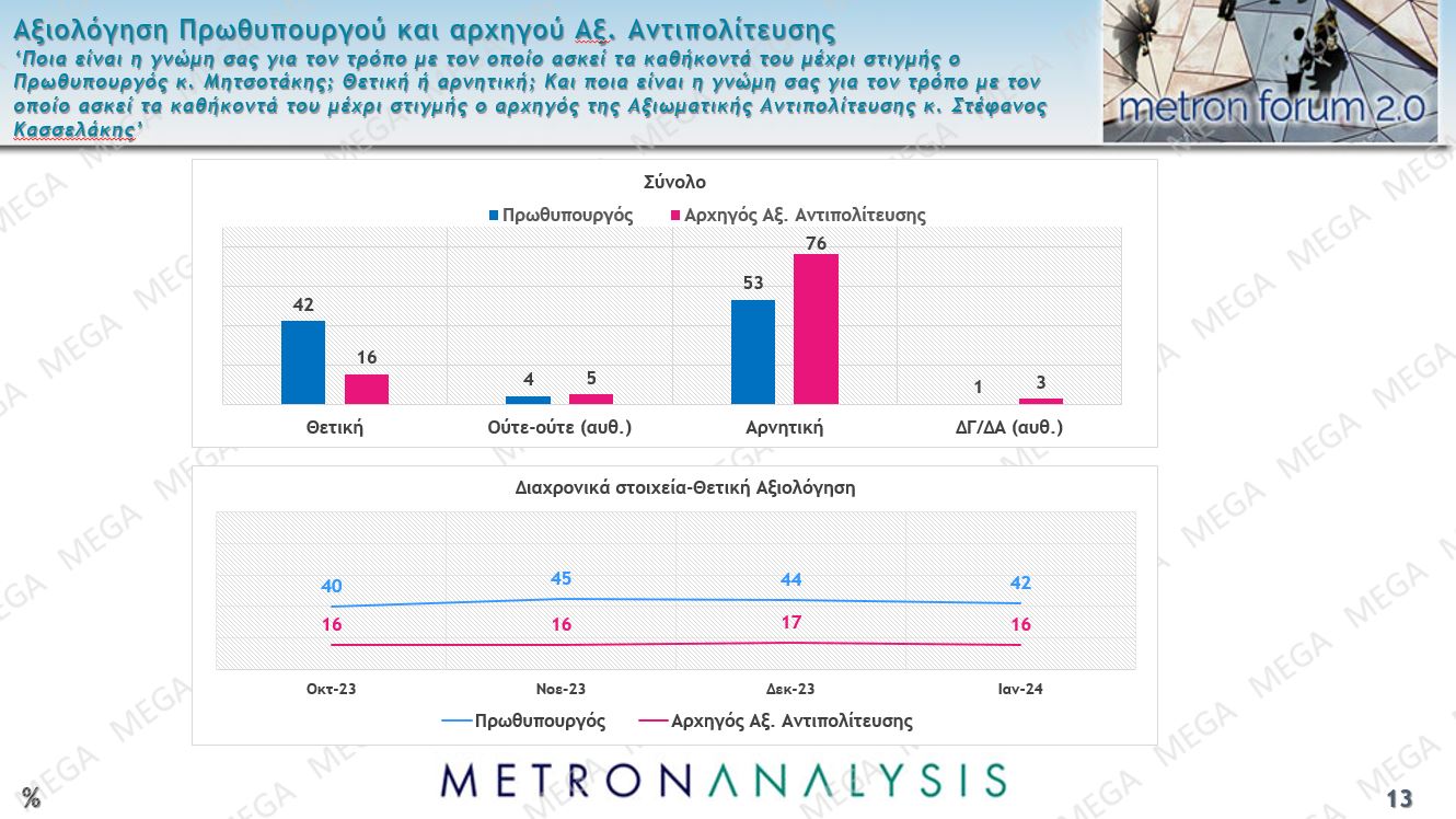 Η σχετική φθορά αποτυπώνεται και στη μικρή υποχώρηση των θετικών γνωμών για τον πρωθυπουργό Κυριάκο Μητσοτάκη, από το 44% στο 42% με τις αρνητικές να φτάνουν το 53%. Και εδώ αποτυπώνεται χαμηλό ποσοστό θετικών γνωμών για τον επικεφαλής του ΣΥΡΙΖΑ Στέφανο Κασσελάκη, που φτάνει μόλις το 16%.