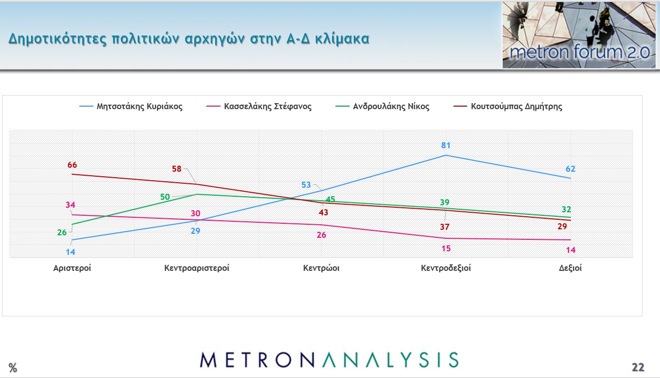 Αντιθέτως, ο Στέφανος Κασσελάκης προηγείται του Νίκου Ανδρουλάκη μόνο στους αριστερούς, ενώ στους κεντροαριστερούς τον φτάνει και ο Κυριάκος Μητσοτάκης. Ο Νίκος Ανδρουλάκης τα πιο υψηλά ποσοστά του στους κεντροαριστερούς και τους κεντροδεξιούς. Τέλος ο Κυριάκος Μητσοτάκης έχει την κορυφαία του επίδοση στους κεντροδεξιούς, με 81% όμως σε όσους δηλώνουν «δεξιοί» υποχωρεί στο 62%.