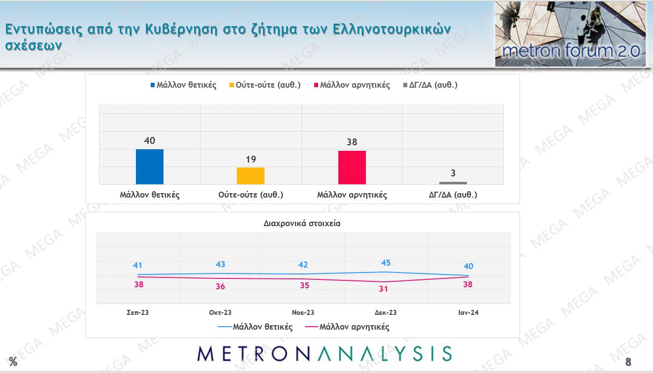 Ως προς τα ελληνικά οι θετικές και οι αρνητικές γνώμες να δείχνουν να ισοσκελίζονται, με τις θετικές να είναι 40% και τις αρνητικές 38%, πράγμα που δείχνει υποχώρηση των θετικών γνωμών και άνοδο των αρνητικών.