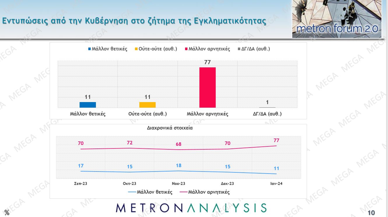 Αντίστοιχα, αποτυχημένη θεωρούν οι ερωτώμενοι την κυβέρνηση στο θέμα της εγκληματικότητας. Οι αρνητικές γνώμες για την κυβερνητική διαχείριση του προβλήματος φτάνουν το 77% και μόνο το 11% έχει κάπως θετική γνώμη, αποτυπώνοντας και ένα ευρύτερο αίσθημα ανασφάλειας που αρχίζει και δημιουργείται.