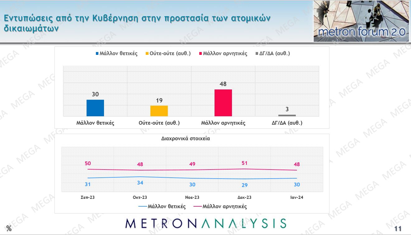Ιδιαίτερο ενδιαφέρον έχει και η άποψη των πολιτών για το ζήτημα των ατομικών δικαιωμάτων, ένα θέμα που έχει πάρει το τελευταίο διάστημα και διεθνείς διαστάσεις ύστερα από το σφυροκόπημα της χώρας μας στο Ευρωπαϊκό Κοινοβούλιο σχετικά με ζητήματα κράτους δικαίου. Το 48% των ερωτώμενων είχαν αρνητική γνώμη για τον τρόπο που χειρίζεται τα ατομικά δικαιώματα η κυβέρνηση και μόνο το 30% υποστηρίζει ότι τα πάει καλά η κυβέρνηση στο συγκεκριμένο θέμα. Στοιχείο που δείχνει ότι η προσπάθεια του πρωθυπουργού να παρουσιάσει ένα «φιλελεύθερο» πρόσωπο δεν εισπράττεται ως τέτοια από την κοινή γνώμη.