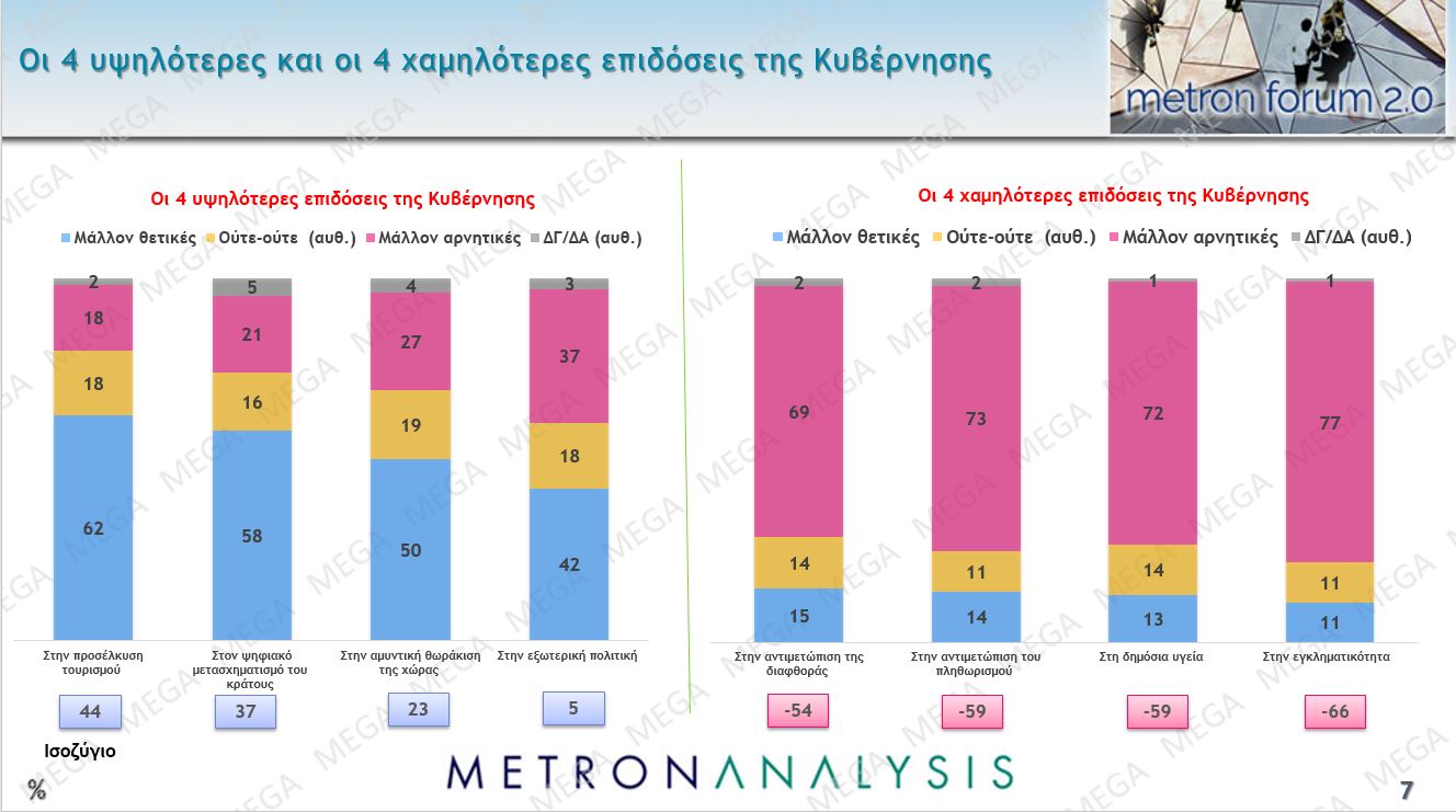 Ιδιαίτερο ενδιαφέρον έχουν όμως και τα προβλήματα στην αντιμετώπιση των οποίων η κυβέρνηση έχει αποτύχει. Έτσι, η κυβέρνηση έχει τις χειρότερες επιδόσεις στο θέμα της εγκληματικότητας, όπου το ισοζύγιο θετικών και αρνητικών γνωμών είναι ιδιαίτερα αρνητικό (-66%), στη δημόσια υγεία (-59%), στην αντιμετώπιση του πληθωρισμού (-59%) και στην αντιμετώπιση της διαφθορας (-54%). Αντιθέτως, καλή βαθμολογία δίνουν οι πολίτες στην προσέλκυση τουρισμού, στην ψηφιακό μετασχηματισμό του κράτους, στην αμυντική θωράκιση της χώρας και στην εξωτερική πολιτική.