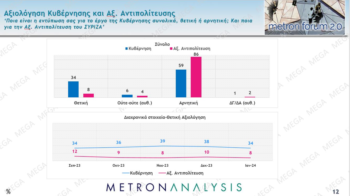 Όμως, παρά την εμφανή φθορά της κυβέρνησης και την αύξηση στοιχείων δυσαρέσκειας για το κυβερνητικό έργο και τους χειρισμούς διαφόρων ζητημάτων, η φθορά της αξιωματικής αντιπολίτευσης είναι ακόμη μεγαλύτερη και είναι πια εμφανές ότι η κρίση του ΣΥΡΙΖΑ επέτεινε μια αρνητική εικόνα. Το αποτέλεσμα είναι ενώ οι θετικές γνώμες για την κυβέρνηση υποχωρούν στο 34%, υποχωρούν και οι θετικές γνώμες για την αξιωματική αντιπολίτευση, που πλέον είναι μόλις στο 8%. Αντίστοιχα, οι αρνητικές γνώμες για την κυβέρνηση βρίσκονται στο 59% και για την αξιωματική αντιπολίτευση στο εντυπωσιακό 86%.
