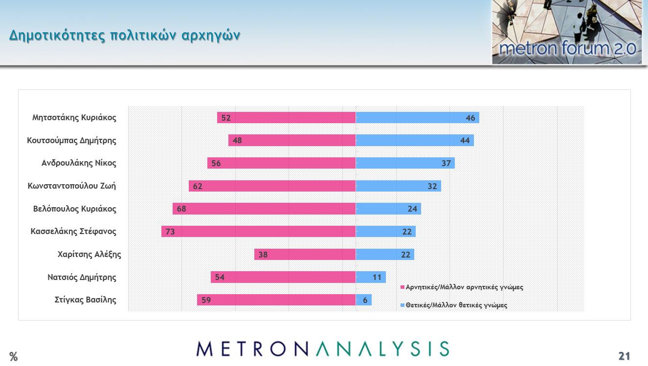 Στο χώρο της άκρας δεξιάς ο Κυριάκος Βελόπουλος φαίνεται πως κατοχυρώνει μια θέση που αποτυπώνεται και στο 24% των θετικών γνωμών. Αντιθέτως, ο Στέφανος Κασσελάκης εξακολουθεί, ακόμη και τώρα που πια είναι ένα οικείο πρόσωπο και όχι ένας άγνωστος πολιτικός, εξακολουθεί να έχει χαμηλή δημοτικότητα στο 22%, όσο παίρνει και ο επικεφαλής της Νέας Αριστεράς, Αλέξης Χαρίτσης.