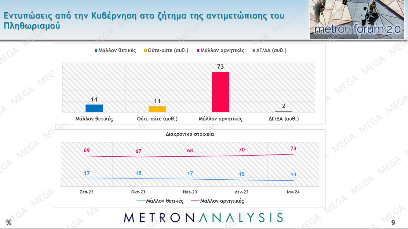 Ιδιαίτερα αρνητικές είναι οι γνώμες των πολιτών για την αντιμετώπιση του προβλήματος του πληθωρισμού, με το 77% των ερωτωμένων να έχουν αρνητική γνώμη και μόλις το 14% να θεωρεί ότι όντως κάτι κάνει η κυβέρνηση. Αυτό είναι αναμενόμενο, εάν δούμε πόσο απασχολεί την κοινωνία το συνεχιζόμενο κύμα ακρίβειας, ιδίως σε προϊόντα όπως τα τρόφιμα.