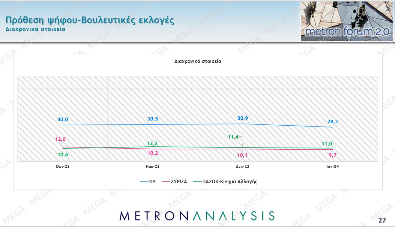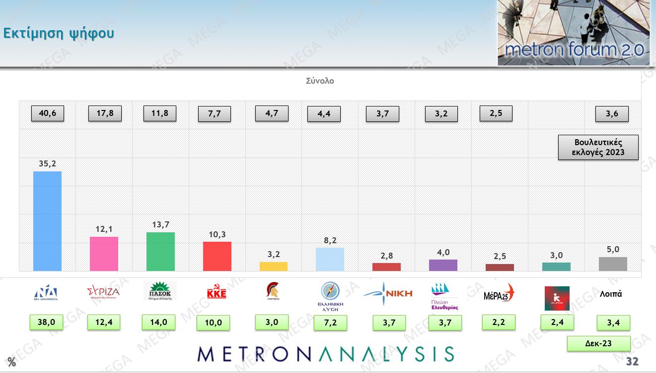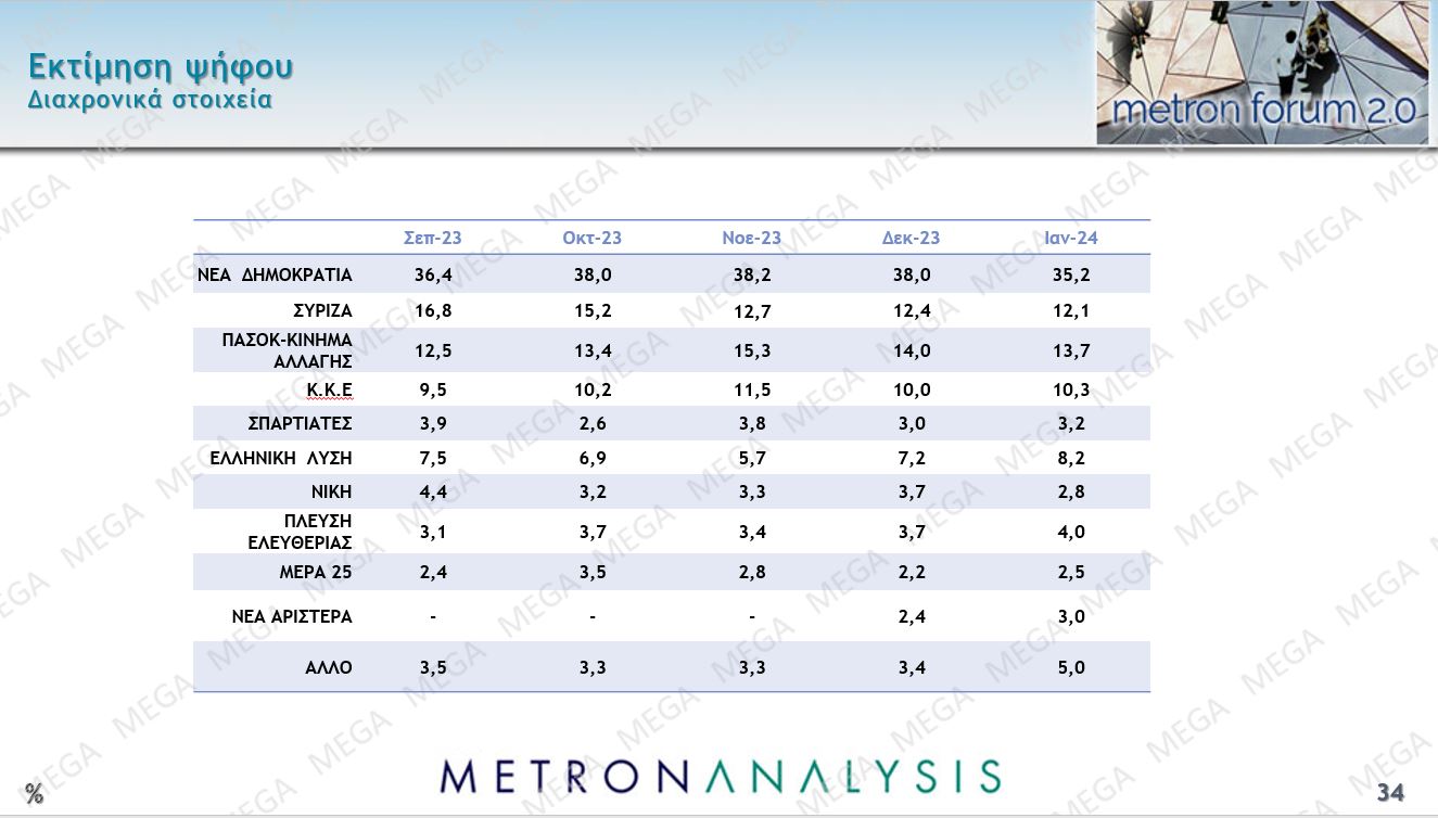 Η τελική εκτίμηση ψήφου που κάνει αυτή τη στιγμή η δημοσκόπηση της Metrion Analysis έχει τη Νέα Δημοκρατία στο 35,2%, πιο κάτω από το 38% του Δεκεμβρίου, το ΠΑΣΟΚ στο 13,7% (14% τον Δεκέμβριο), το ΣΥΡΙΖΑ να υποχωρεί στο 12,1%, το ΚΚΕ να ανεβαίνει στο 10,3%. Είναι μια εικόνα που δείχνει ότι γύρω από τη δεύτερη και την τρίτη θέση θα δοθεί μια πραγματική μάχη όταν γίνουν εκλογές.