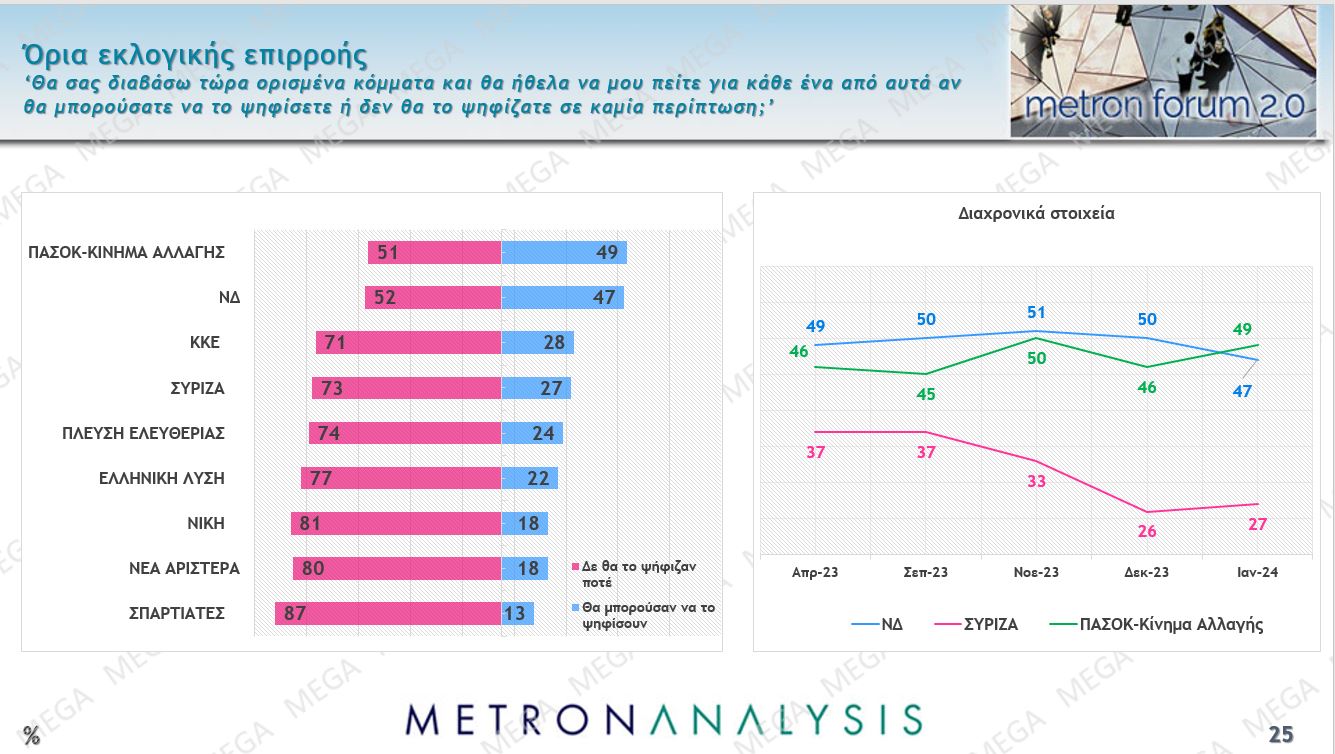 Ως προς τις ερωτήσεις για τους κομματικούς συσχετισμούς, στην ερώτηση για τα όρια εκλογικής επιρροής, που μετράει εάν υπάρχει έστω και μικρή πιθανότητα να ψηφίσει κάποιος ένα κόμμα, στην κορυφή βρίσκεται το ΠΑΣΟΚ με 49% και ακολουθεί η ΝΔ, με 47%, ενώ έχει ενδιαφέρον ότι είναι ελαφρά περισσότεροι αυτοί που θα μπορούσαν να ψηφίσουν το ΚΚΕ (28%) από ό,τι τον ΣΥΡΙΖΑ (27%).