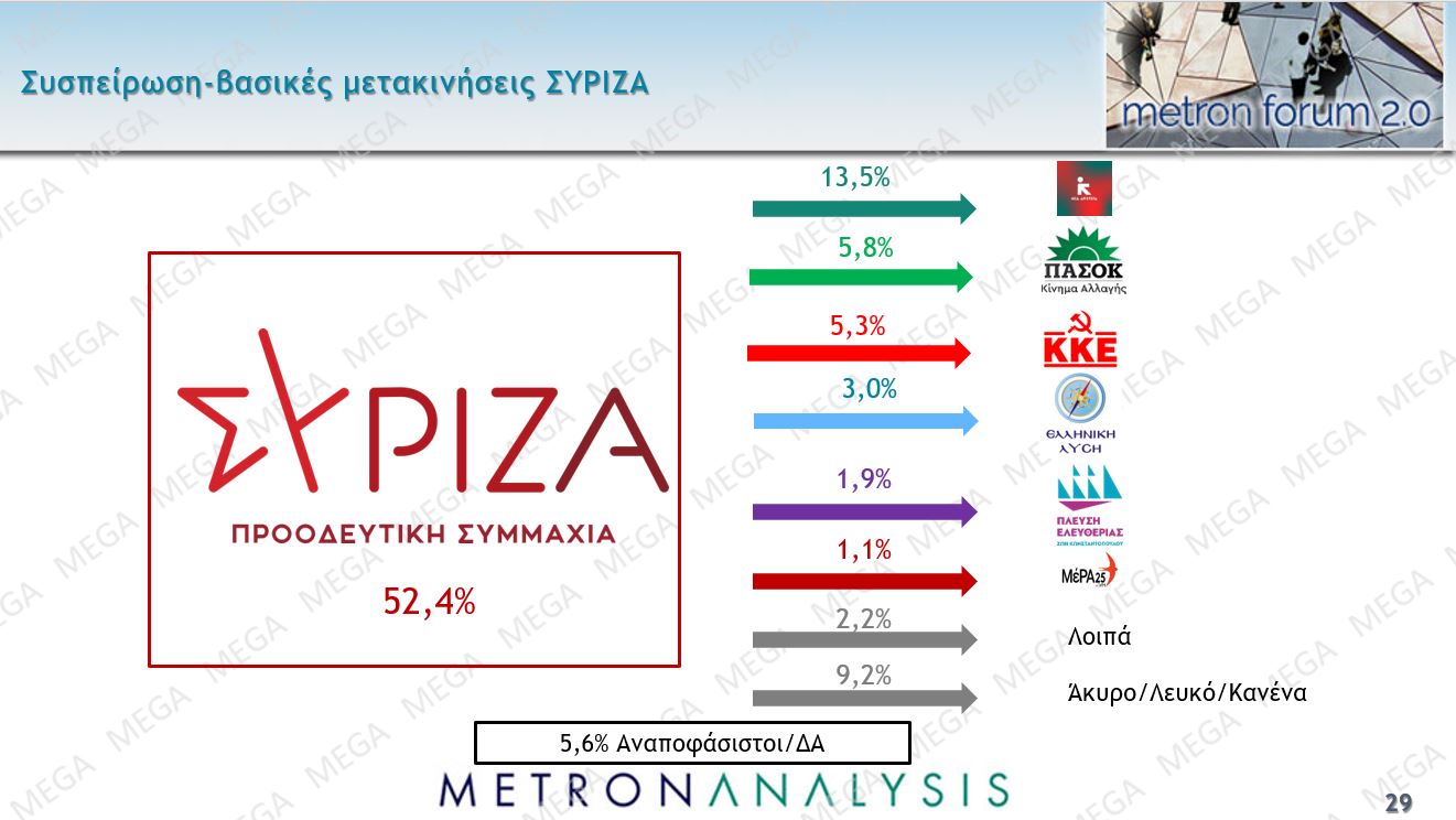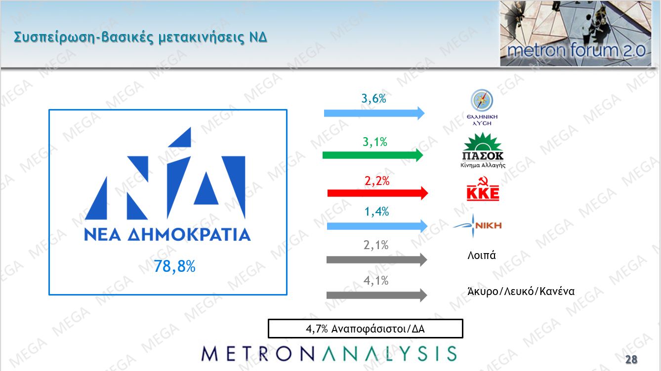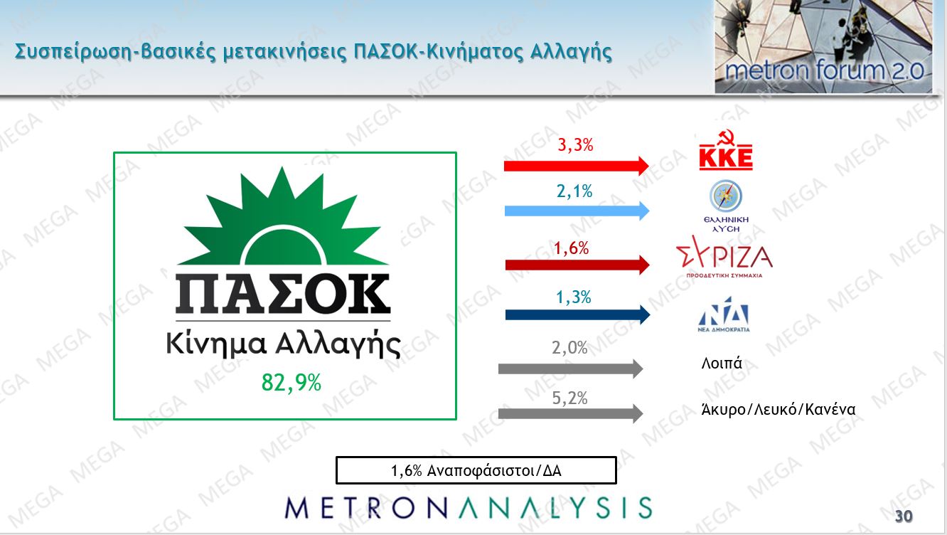 Ενδιαφέρον έχουν και οι μετακινήσεις. Η ΝΔ έχει τις μεγαλύτερες απώλειες ψήφου προς την Ελληνική Λύση, ο ΣΥΡΙΖΑ προς την Νέα Αριστερά, το ΠΑΣΟΚ προς το ΚΚΕ.