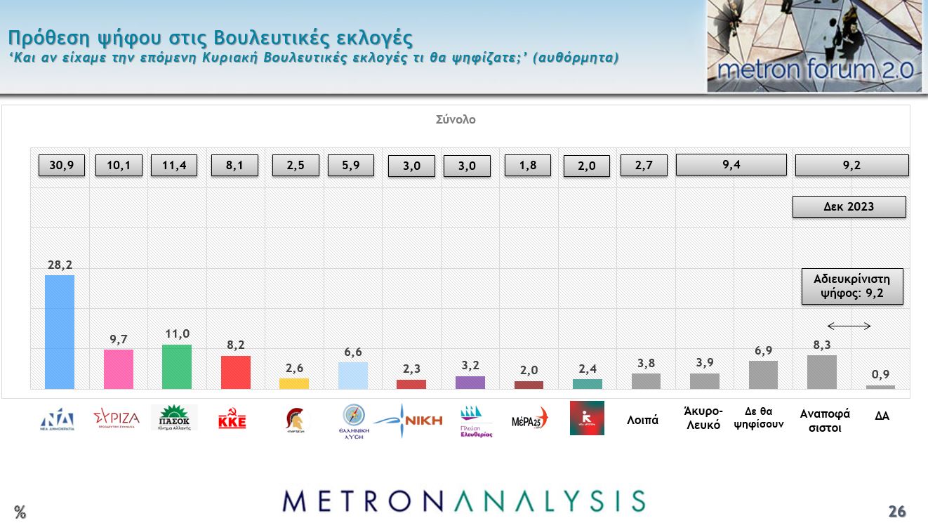 Όλα αυτά αποτυπώνονται και στην πρόθεση ψήφου. Η Νέα Δημοκρατία εμφανίζει απώλειες πάνω από 2%, καθώς από 30,9% στην προηγούμενη δημοσκόπηση υποχωρεί στο 30,9%. Ο ΣΥΡΙΖΑ για πρώτη φορά υποχωρεί στη ζώνη των «μονοψήφιων» ποσοστών με 9,7, ενώ το ΠΑΣΟΚ «κατοχυρώνεται» ως δημοσκοπική αξιωματική αντιπολίτευση, με μια μικρή υποχώρηση από το 11,4% στο 11% και το ΚΚΕ εμφανίζει μικρή άνοδο στο 8,2%.