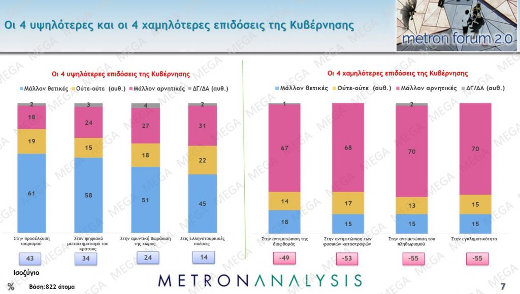 Αντιθέτως, η κυβέρνηση συναντά την αποδοχή και θετική εκτίμηση των πολιτών σε σχέση με τα πεπραγμένα της σε ζητήματα όπως η προσέλκυση τουριστών, ο ψηφιακός μετασχηματισμός του κράτους, η αμυντική θωράκιση του κράτους και τις ελληνοτουρκικές σχέσεις.