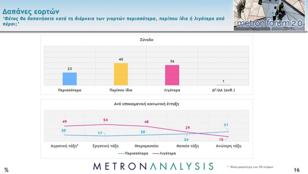 Και αυτό αποτυπώνεται και στο πώς βλέπουν τις δαπάνες των γιορτών. Οι περισσότεροι απαντούν τα ίδια (40%), η αμέσως επόμενη απάντηση είναι τα ίδια (36%) και μόλις το 23% δηλώνει ότι θα ξοδέψει περισσότερα.