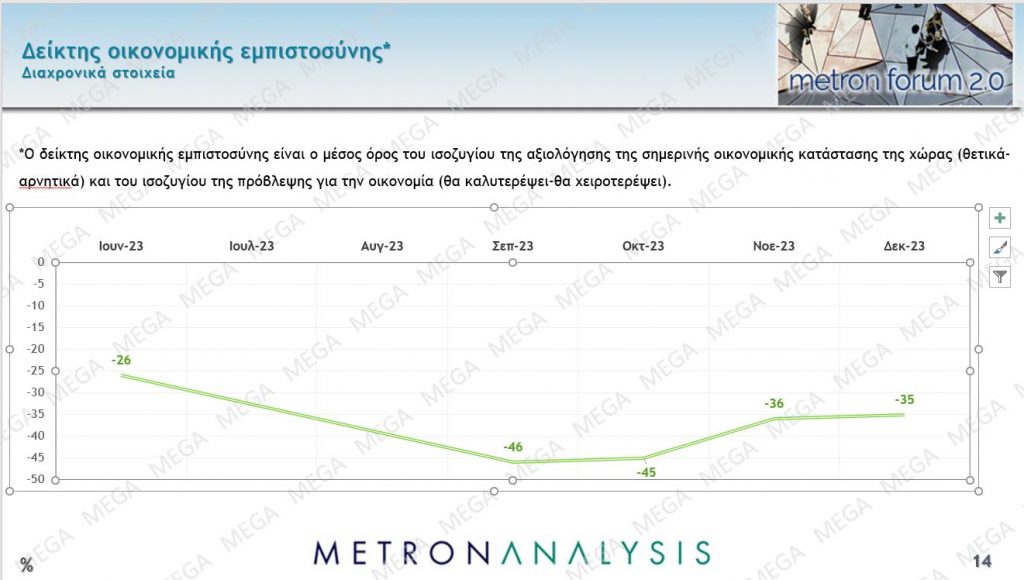Ο δείκτης οικονομικής εμπιστοσύνης που συνδυάζει την εκτίμηση για την κατάσταση της οικονομίας με την εκτίμηση της πρόβλεψης δείχνει να βελτιώνεται. Το ισοζύγιο παραμένει αρνητικό, στο -35%, όμως εμφανίζει βελτίωση εάν σκεφτούμε ότι τον Σεπτέμβριο ήταν στο -45%.