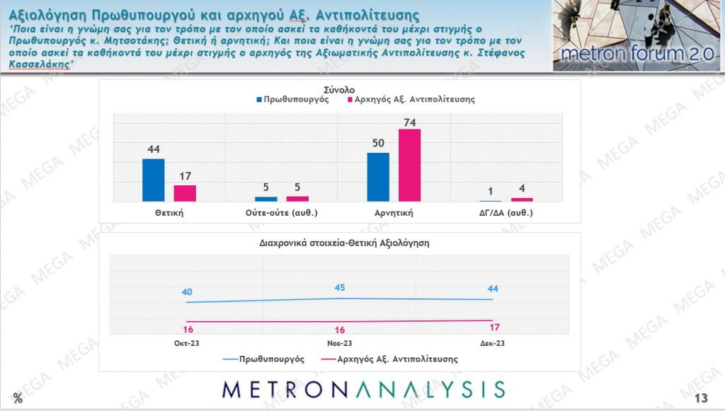 Αντίστοιχα και τα αποτελέσματα ως προς την αποτίμηση του πρωθυπουργού και του αρχηγού της αξιωματικής αντιπολίτευσης, όπου και πάλι ο πρωθυπουργός υπερτερεί σε αυτή τη μέτρηση.