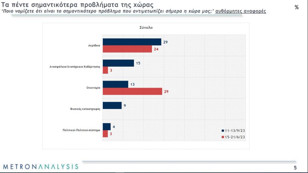 Αυτό φαίνεται και στις αυθόρμητες απαντήσεις που δόθηκαν στην ερώτηση για το σημαντικότερο πρόβλημα που αντιμετωπίζει σήμερα η χώρα. Η ακρίβεια είναι το σημαντικότερο πρόβλημα για το 29%, όμως έχει ιδιαίτερη σημασία ότι το 15% θεωρεί ως μεγαλύτερο πρόβλημα την ανασφάλεια και την ανεπάρκεια της κυβέρνησης (απάντηση που τον Ιούνιο έδινε μόνο το 3%).