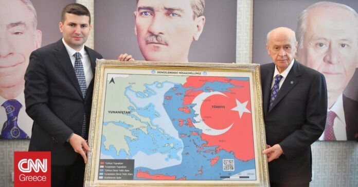 Ο Ντεβλέτ Μπαχτσελί φωτογραφήστηκε χθες στην έδρα της εθνικιστικής οργάνωσης με χάρτη, στον οποίο τα περισσότερα νησιά του Αιγαίου, καθώς και η Κρήτη, απεικονίζονται ως τουρκική επικράτεια. Μόλις λίγες ώρες νωρίτερα, ο Τούρκος υπουργός Άμυνας, Χουλουσί Ακάρ, είχε εκτοξεύσει απειλές κατά της Ελλάδας για το Αιγαίο.