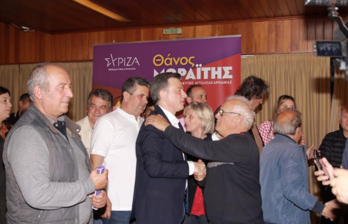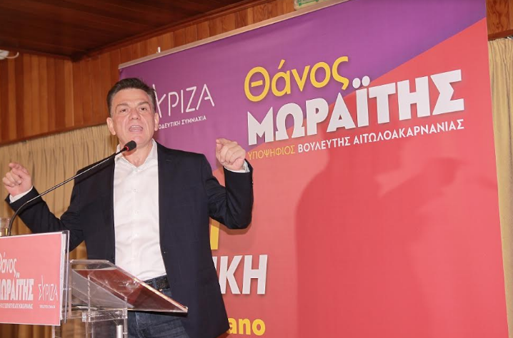 Ο Θάνος Μωραΐτης φανερά συγκινημένος από το κλίμα ενθουσιασμού και νίκης που επικρατούσε, μέσα στην ασφυκτικά γεμάτη από εκατοντάδες πολίτες αίθουσα του Ξενοδοχείου Liberty, ξεκίνησε την ομιλία του απευθύνοντας θερμό χαιρετισμό στον δημοκρατικό λαό της Ιεράς Πόλης του Μεσολογγίου, την οποία χαρακτήρισε παγκόσμιο σύμβολο των αγώνων για ελευθερία και ανεξαρτησία και πόλη της πνευματικής αναγέννησης του έθνους και του πολιτισμού μας.