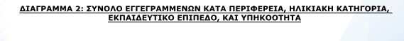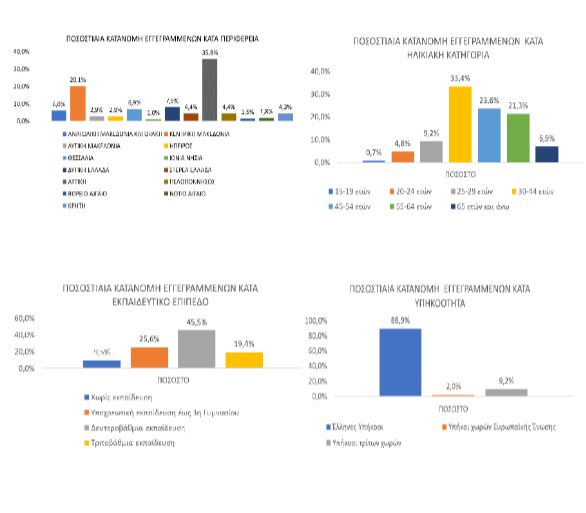 Μεταξύ των περιφερειών της χώρας, η Περιφέρεια Αττικής και η Περιφέρεια Κεντρικής Μακεδονίας καταγράφουν τον μεγαλύτερο αριθμό εγγεγραμμένων, ο οποίος ανέρχεται σε 310.301 άτομα (ποσοστό 35,8%) και 173.982 άτομα (ποσοστό 20,1%), αντίστοιχα.