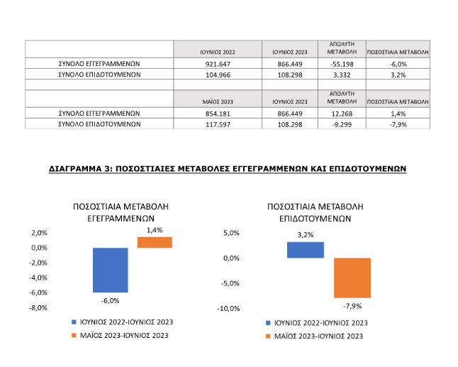 Στο Διάγραμμα 2 παρουσιάζονται οι μεταβολές των εγγεγραμμένων και των επιδοτούμενων από τον αντίστοιχο μήνα του προηγούμενου έτους Ιούνιο 2022, καθώς και από τον προηγούμενο μήνα Μάϊο 2023.