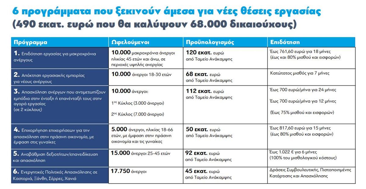 - Ολοκληρωμένο πρόγραμμα αναβάθμισης δεξιοτήτων-επανειδίκευσης και βραχυπρόθεσμης απασχόλησης για 15.000 ανέργους (25-45 ετών) με συνολικό προϋπολογισμό: 92 εκατ. ευρώ. Το πρόγραμμα θα χρηματοδοτεί έως και το 100% του μισθολογικού κόστους για μια περίοδο 6 μηνών με υποχρέωση για διατήρηση της θέσης 2 επιπλέον μήνες μετά τη λήξη της επιχορήγησης.