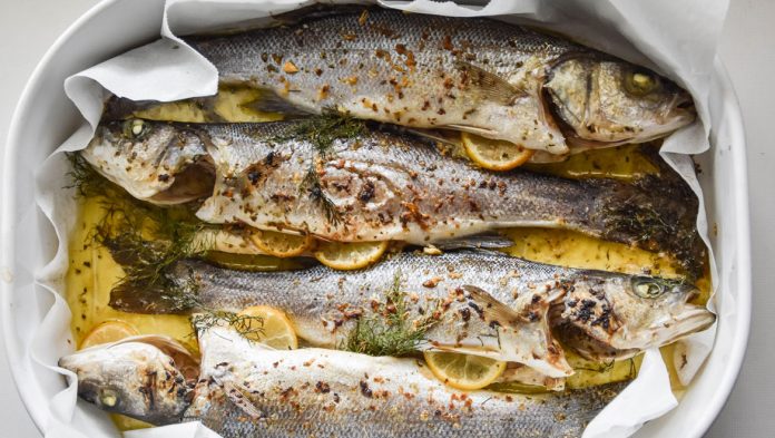 Καθαρίζουμε καλά τα ψάρια, τα αλατίζουμε και τα τοποθετούμε σε λαδωμένο πυρέξ.