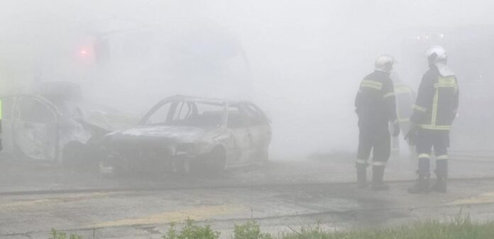 Δύο άνθρωποι εντοπίζονται απανθρακωμένοι μέσα στο ένα από τα αυτοκίνητα.
