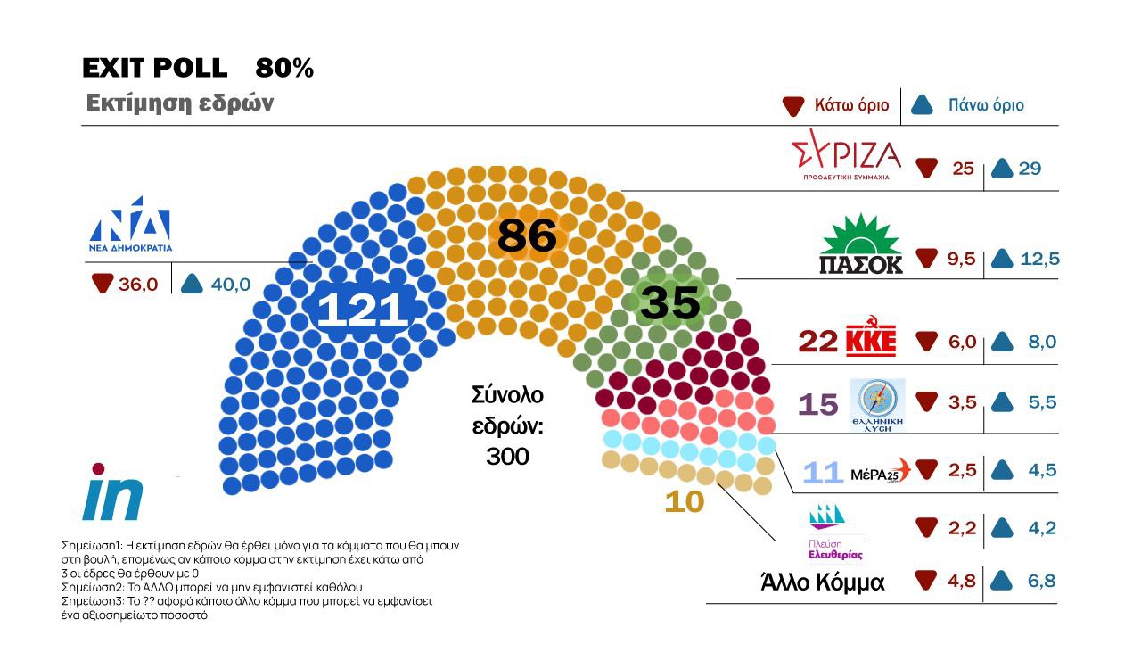 Συγκεκριμένα, η ΝΔ θα κινηθεί μεταξύ 36% έως 40% και θα λάβει περί τις 121 έδρες (38%), ο ΣΥΡΙΖΑ 25% έως 29% περί τις 86 έδρες (28%), το ΠΑΣΟΚ από 9,5% έως 12,5% λαμβάνοντας 35 έδρες (11%), το ΚΚΕ από 6% έως 8% γύρω στις 22 έδρες (7%), η Ελληνική Λύση από 3,5% έως 5,5% δηλαδή γύρω στις 15 έδρες (4,5%), ενώ το ΜέΡΑ25 κινείται μεταξύ 2,5% και 4,5% με 11 έδρες και η Πλεύση Ελευθερίας από 2,2% έως 4,2% με 10 έδρες.