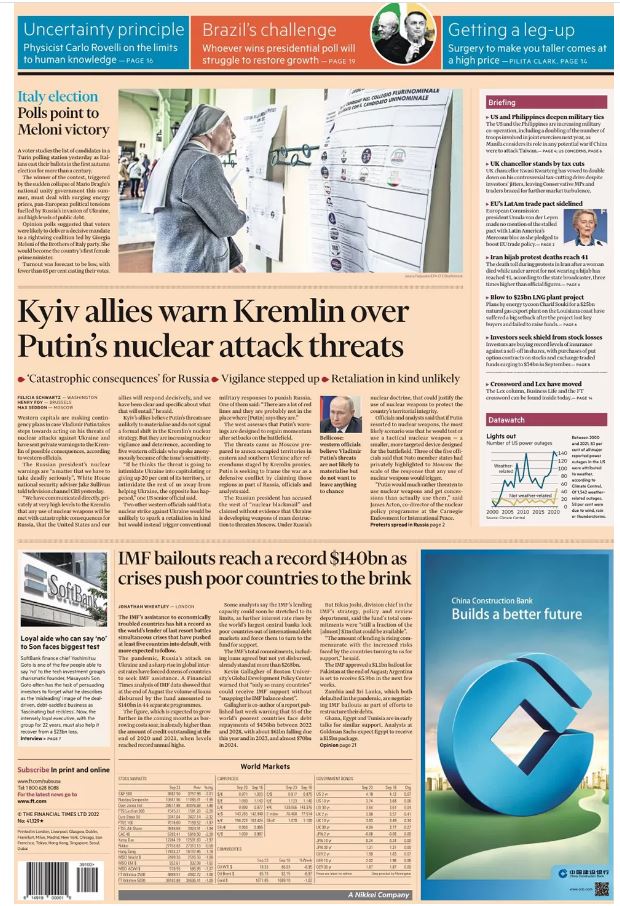 Η Ιταλία «κινδυνεύει» με την νίκη του FdI, αλλά «δεν θα υπάρξει στροφή προς τον εξτρεμισμό» με την εκλογή της πρώτης γυναίκας και πιο ακροδεξιάς πρωθυπουργού της χώρας μετά τον Β Παγκόσμιο Πόλεμο, εκτιμούν οι Financial Times.
