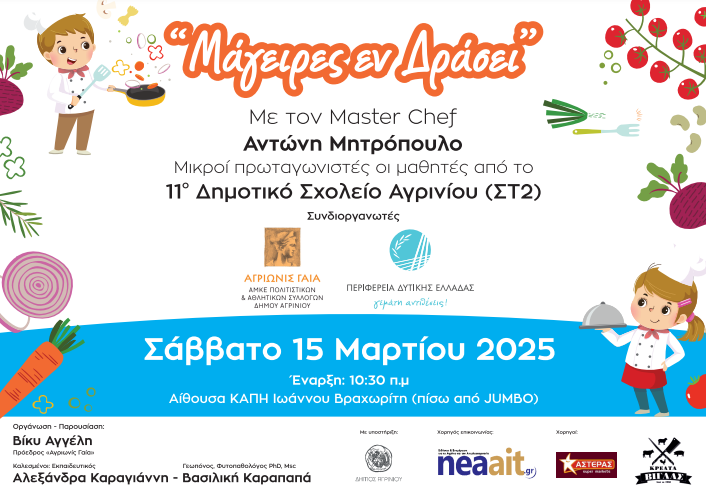 Πιο συγκεκριμένα η Α.Μ.Κ.Ε. «Αγριωνίς Γαία» Πολιτιστικών & Αθλητικών Συλλόγων Δήμου Αγρινίου» σας καλεί στην εκπαιδευτική δράση με θέμα: «Μάγειρες εν δράσει» με τον γνωστό MasterChef Αντώνη Μητρόπουλο, η οποία θα λάβει χώρο το Σάββατο 15 Μαρτίου 2025 στο Αγρίνιο (Αίθουσα ΚΑΠΗ Αγρινίου, Ιωάννου Βραχωρίτη).